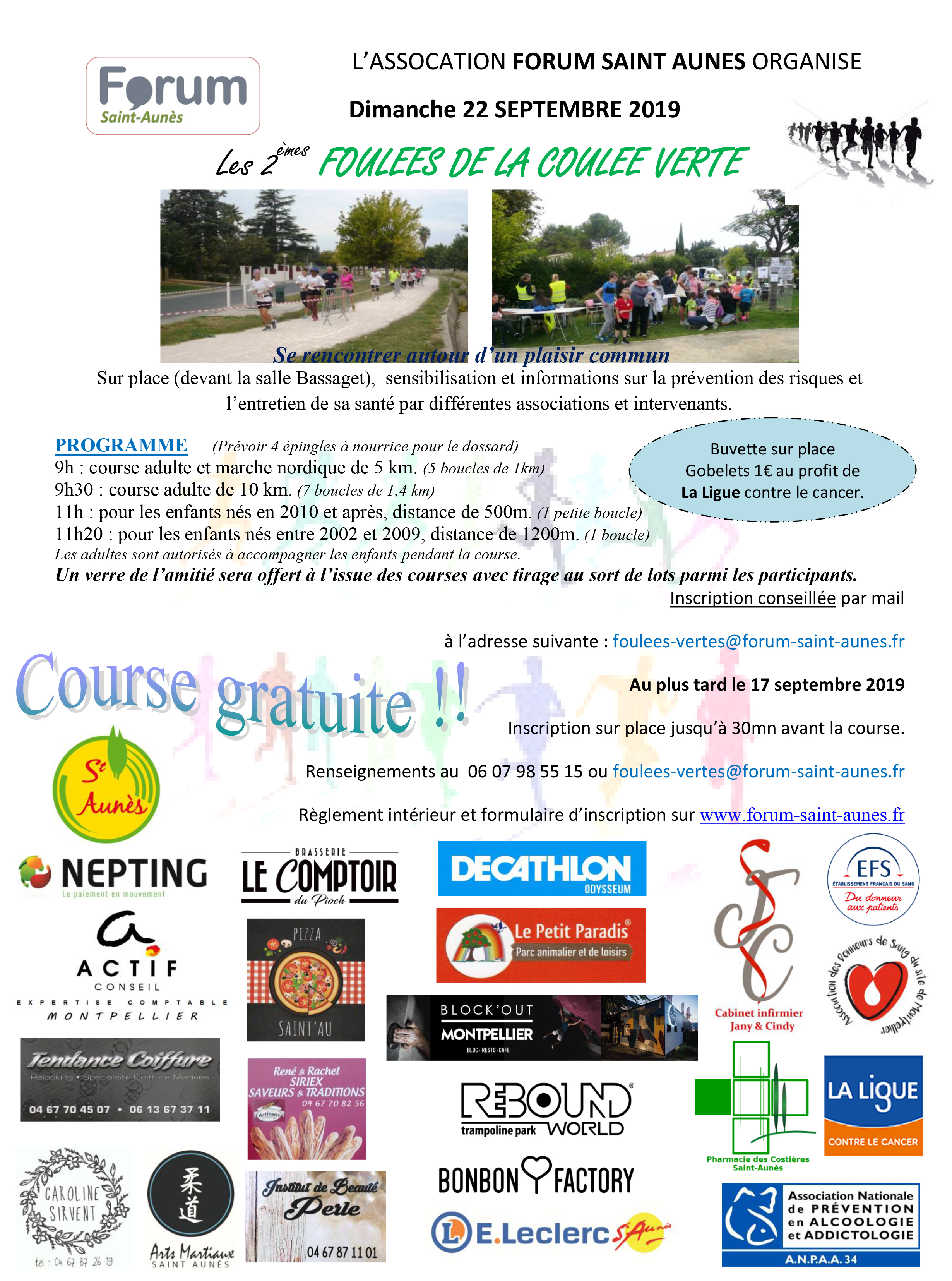 Inscriptions à l’adresse suivante : foulees-vertes(at)forum-saint-aunes.fr