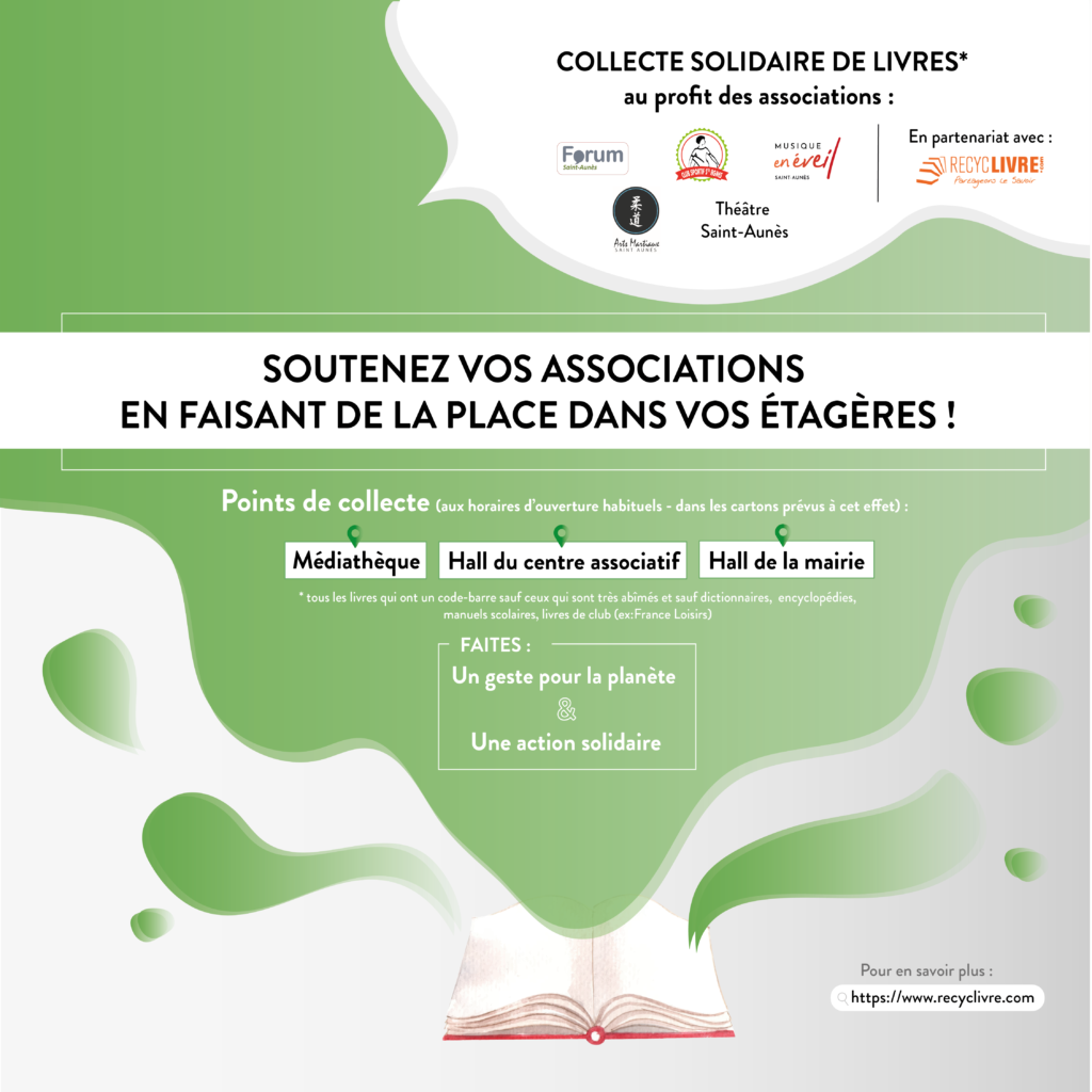 Le principe : Vous débarrassez vos étagères de vos livres, DVD, CD, vinyles et jeux vidéos dont vous ne voulez plus dans 3 points de collecte à Saint-Aunès. Nous les collectons et ils seront remis en circulation sur le site web de recyclivre (www.recyclivre.com). Vous leur donnez une seconde vie !