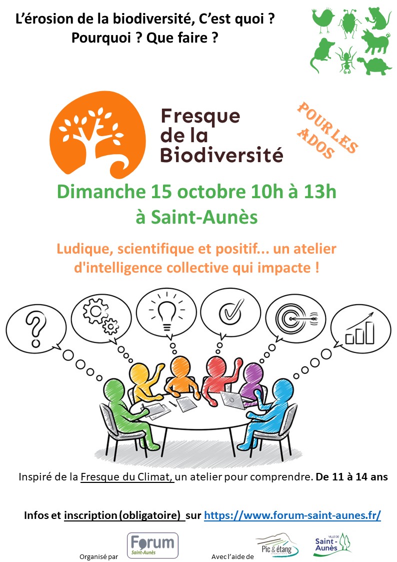 –Biodiversité « Junior », de 11 à 15 ans, inscription obligatoire sur https://www.fresquedelabiodiversite.org/#participer (filtrez par date), 14 places
