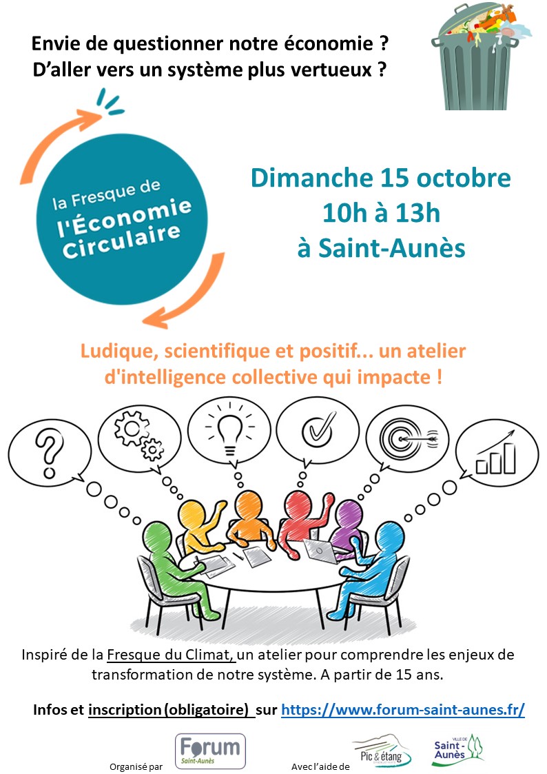 – Économie circulaire, à partir de 15 ans, inscription obligatoire par e-mail à forumsaintaunes@gmail.com. Participation = 3 euros, 14 places