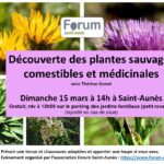 Découverte des plantes sauvages comestibles et médicinales avec Thérèse Gonet Samedi 18 mars à 10h à Saint-Aunès Gratuit, sur inscription (obligatoire) à forumsaintaunes@gmail.com, (reporté en cas de pluie) Après un petit briefing sur les bonnes pratiques de la cueillette (lieu non pollué, respect des lieux, ramasser sans anéantir, lavage, intoxications possibles), thérèse a transmis avec