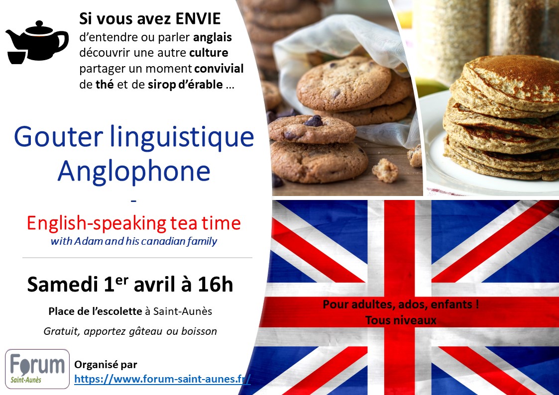 Si vous avez ENVIE d’entendre ou parler anglais, découvrir une autre culture, partager un moment convivial, ou tout simplement de déguster thé et sirop d’érable …VENEZ à notre Gouter linguistique Anglophone / English-speaking tea time with Adam and his canadian family