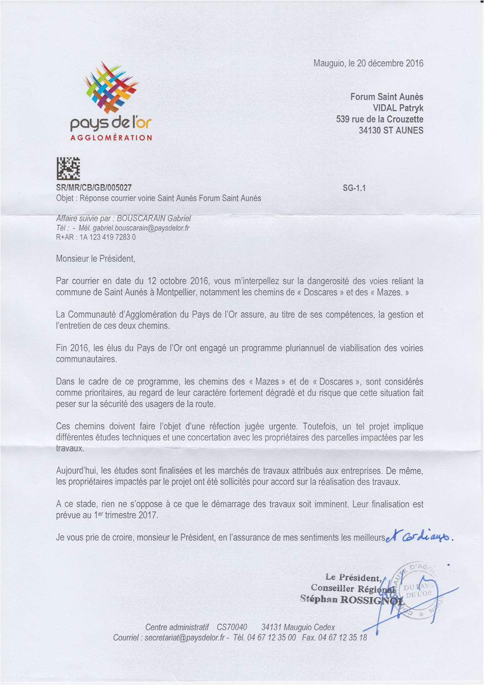 Ci-joint le courrier de M.Rossignol qui précise que les travaux pourraient débuter au premier trimestre 2017.