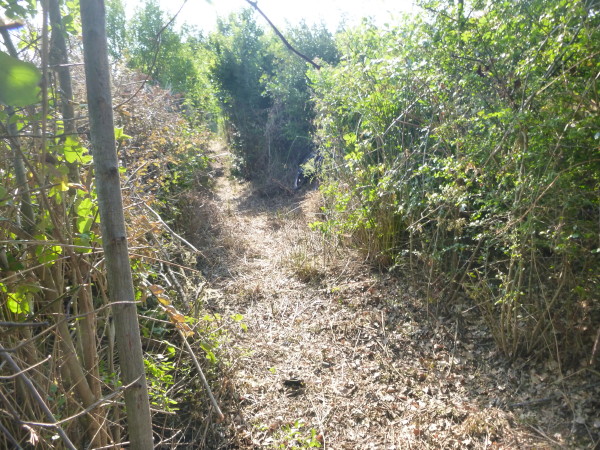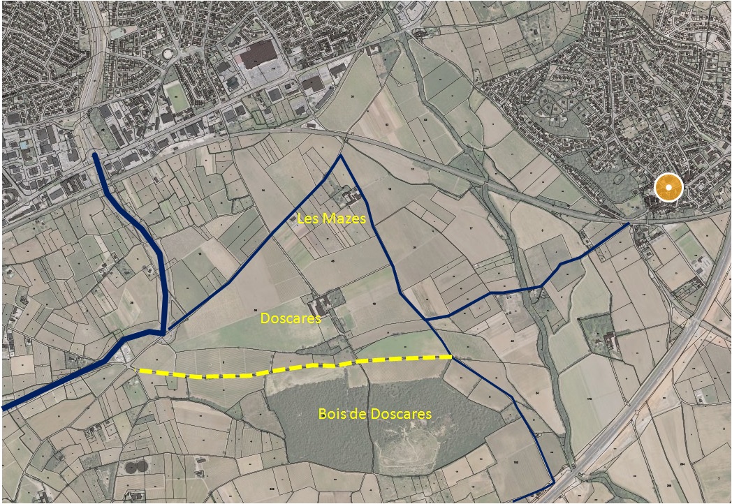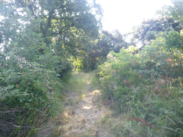 Cette carte met en évidence de multiples routes et chemins qui sillonnent la commune. Il apparaît que certains chemins communaux ne sont plus praticables alors même qu’il présentent un intérêt majeur. C’est le cas pour le chemin ci-dessous (en pointillés jaunes) :