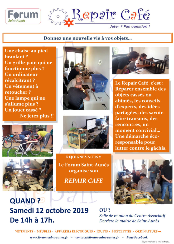 Depuis 2017, Forum Saint Aunès participe à l’initiative mondiale « Repair Café ». Le Repair Café est un événement qui a pour objet d’apprendre à réparer en y associant convivialité, entraide, partage, rencontres, échanges.