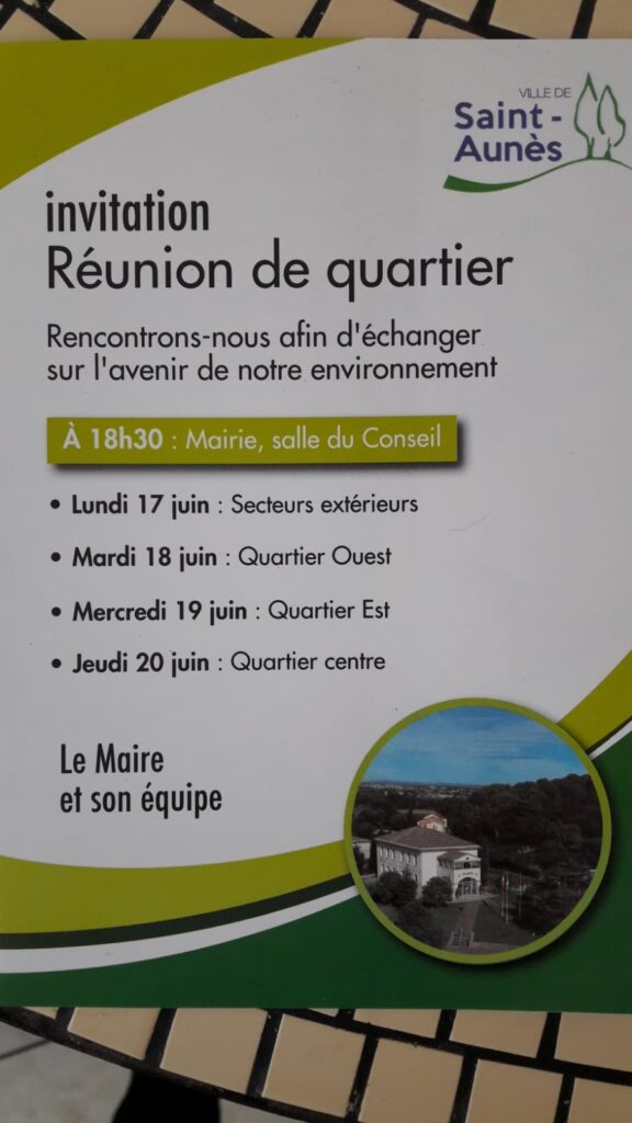 CitoyennetéVie municipale Réunions publiques de quartier 2024 à Saint-Aunès 5 juin 2024 admin 742 Views Quartier, Réunion publique voici le programme et le plan pour vérifier à votre quartier d’appartenance. Pour savoir ce qui s’est dit les années précédentes (et vérifier l’avancement), consultez nos compte-rendus : 2023 2022 2019