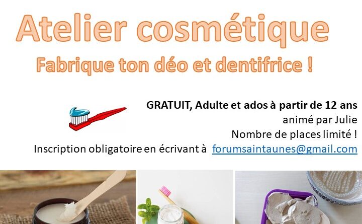 Read MoreAtelier adulte de « Fabrication de cosmétiques » organisé par Forum Saint Aunès Inscription obligatoire par e-mail forumsaintaunes(at)gmail.com. Gratuit, A partir de